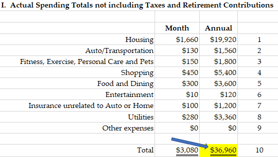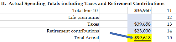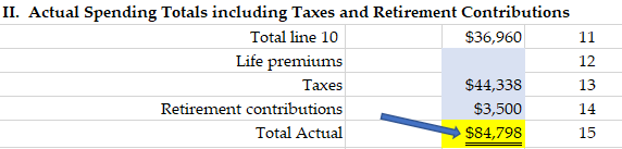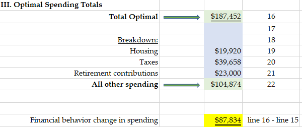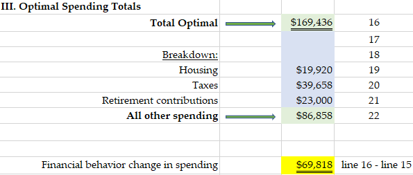 An algorithm under the hood produces the result in line 22. With housing expenses, income and social security taxes, and retirement contributions considered, Chrissy can fit her other actual expense allocations plus another $69,818 of fun into next year’s budget. She is not sacrificing her future either.