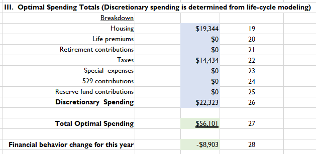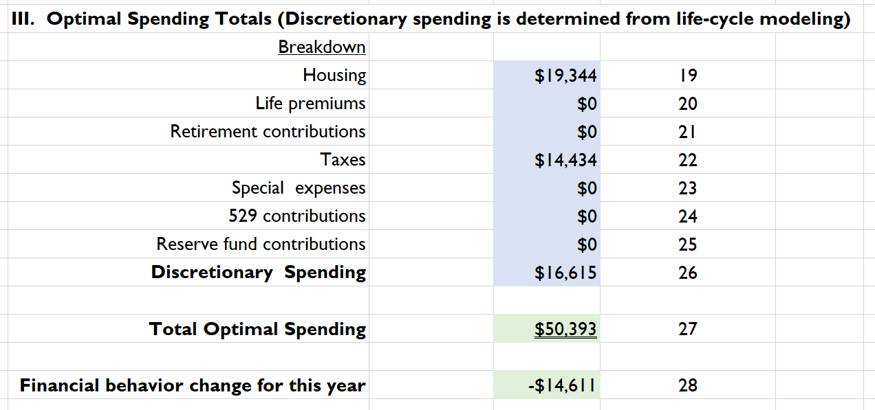 Colorado’s optimal financial plan boils down to the simplicity of Panel III. This is Colorado’s first-year guidance derived in the context of the next thirty years that will take her to age 92. Lines 19 through 25 are placeholders because they are usual considerations for most households. For Colorado, most are zeroes except a restatement of her housing expenses in line 19, and an estimate for her federal, state, and FICA tax amounts in line 22.2 Line 26 is very important. It is found in the optimization method and is the key component of Colorado’s magic number, a topic I have written about before. Listed simply as discretionary spending, the interpretation is that Colorado can spend $16,615 on all other expenses above housing and taxes. The best baseline planning requires a substantial cut in expenses, and some of the expense cuts involve funding new savings. Which expenses to cut? That is Colorado’s choice.
