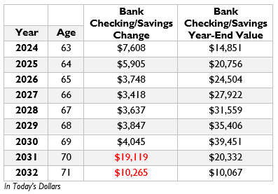 Why is her optimal discretionary spending so low? Because she needs to save more immediately in amounts listed in the table below. The savings prescription is the result of optimal planning and sizeable amounts are recommended for Colorado’s remaining work years, initially setup to be through age 69. At 70, Colorado has SS retirement benefits as an income substitute, but they provide less than 60% of her former after-tax labor income according to my estimates. Built-up bank checking and savings begins funding the living standard at age 70, as seen in the table.