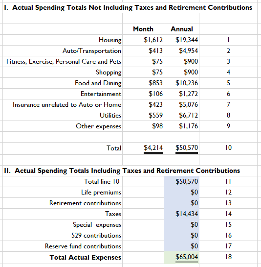 Colorado’s expenses are itemized in Lindsey Stanberry’s posting. I rolled them into an expense worksheet, and the monthly and annual totals are listed in this table.1 The annual expense total before any consideration for federal, state, and social security taxes is about $50k (Panel I, line 10), and it is pushed up to $65k with taxes (Panel II, line 18). Colorado’s taxes are relatively high because her state has an income tax, and she has to pay both sides of the social security tax, 15.3%.